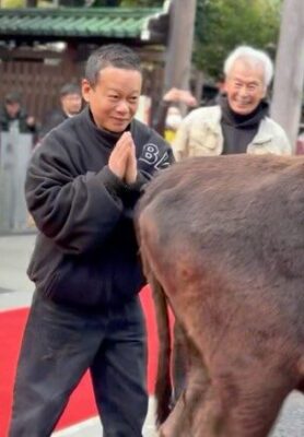 馬踊りが終わった時、手こずらされたふくよさんを「こいつ」という感じで愛情たっぷりにポンと叩く泯さん。会場からは、温かな笑いが。神社の境内が大きな拍手で包まれました。
